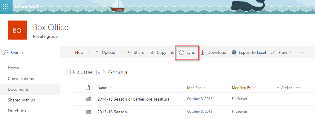 4. SharePoint will open in your browser. From there, to get the files to appear in your File Explorer, select "Sync" at the top: